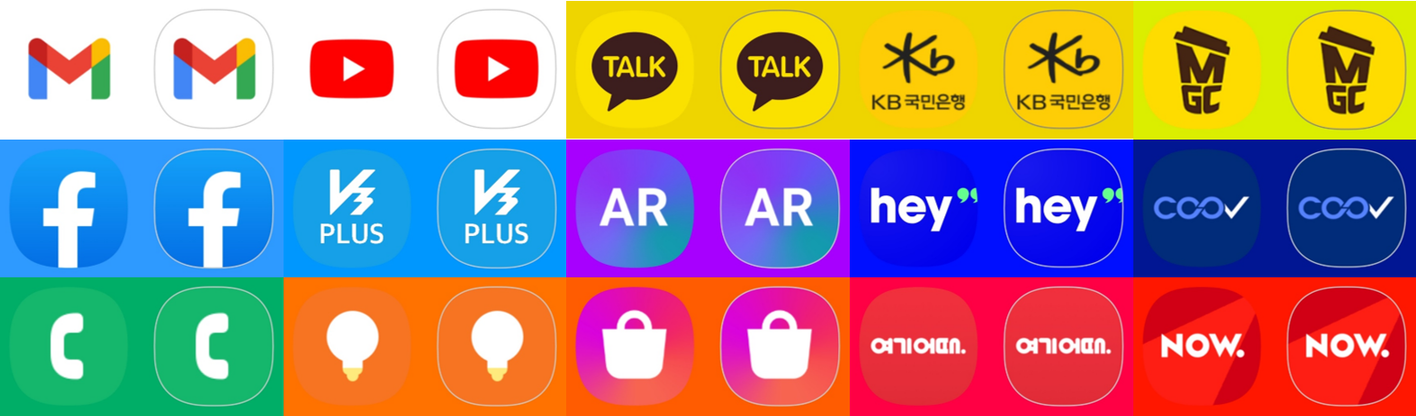그러나 여기서 또 다른 문제가 발생하였는데, 각각의 로직마다 혹은 앱이나 웹사이트의 아이콘 테두리 모양이 제각각이라는 점 때문에 디자인 균형감을 잃게 된다는 것이었습니다.