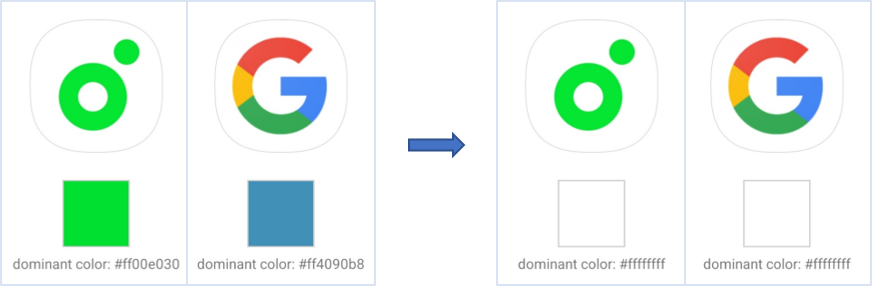 Google 앱과 같이 아이콘 배경색과 parent view 의 배경색이 같은 경우 테두리 경계가 모호해지면서 디자인 균형감을 잃게 됩니다. 이를 해결하기 위해 이미지가 삽입될 때, 삽입된 이미지의 배경색과 parent view 의 배경색을 비교하여 두 색상이 거의 일치하는 경우에는 자동으로 Border Stroke 을 그려주도록 해보겠습니다.