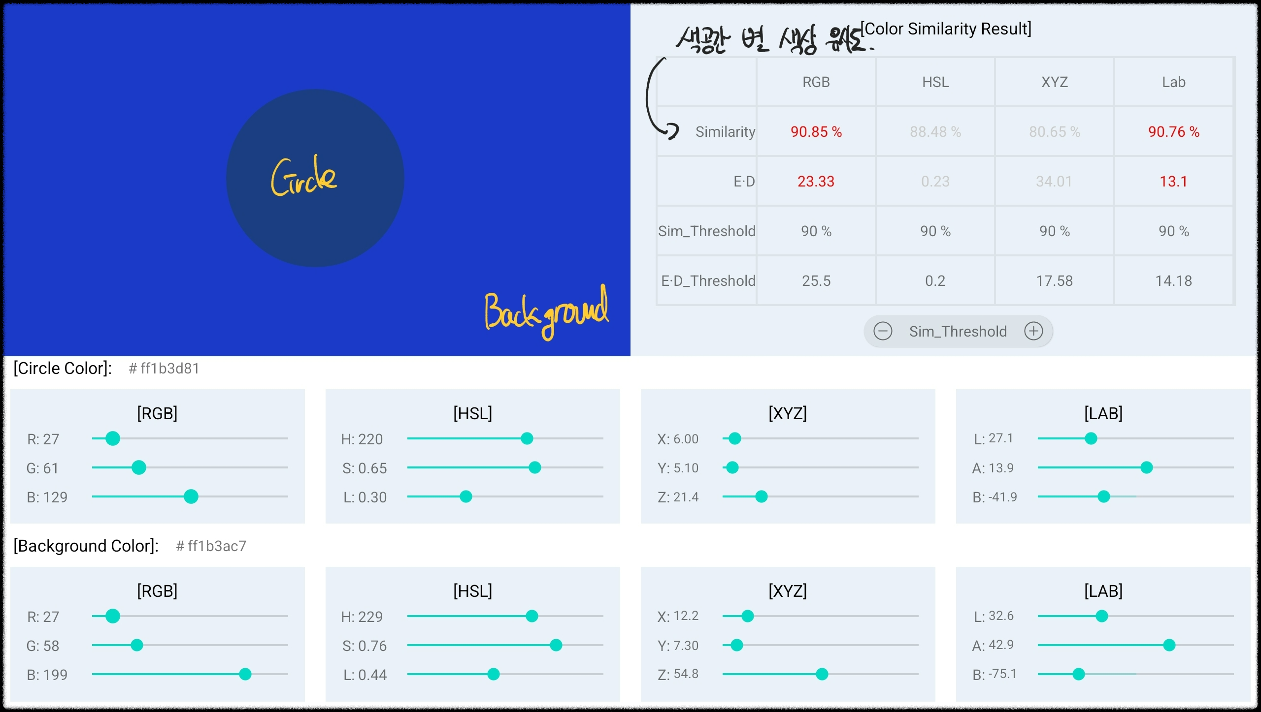 그래서 Color Difference 를 구하는 방식에 대한 개선이 필요했고, 아래 링크 내용을 참고하여 계산식을 다시 적용한 뒤 실험한 모습입니다.