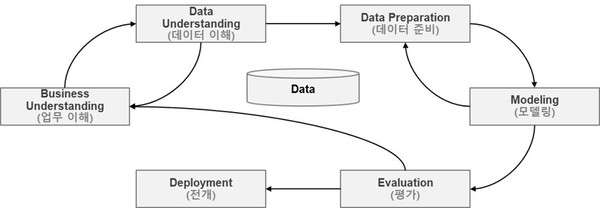 - 비지니스/도메인 이해 <-> 데이터 이해 <-> 전처리 <-> 모델링 <-> 평가 <-> 개발