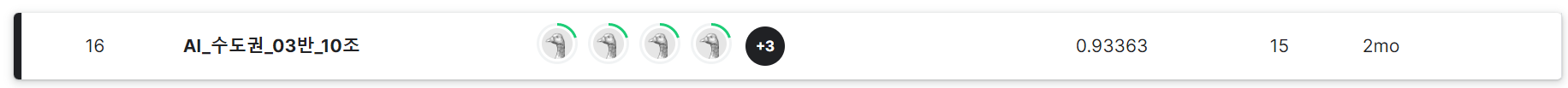 위와 같이 파라미터 튜닝을 마친 후 테스트셋으로 예측한 결과를 제출하여 총 42개 팀 중 16위까지 순위를 올리며 마무리하게 되었다(5위권까지는 0.01 이내의 근소한 차이였어서 조금만 더 튜닝할 시간이 있었다면 하는 아쉬움이 있었다)