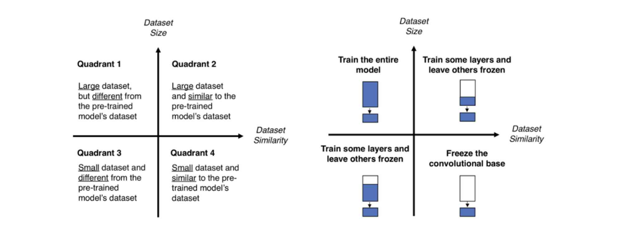 학습할 데이터셋의 크기와 해당 데이터셋이 pre-trained model이 기존에 학습한 데이터셋과 얼마나 유사한지에 따라 Fine-tuning 전략이 달라진다