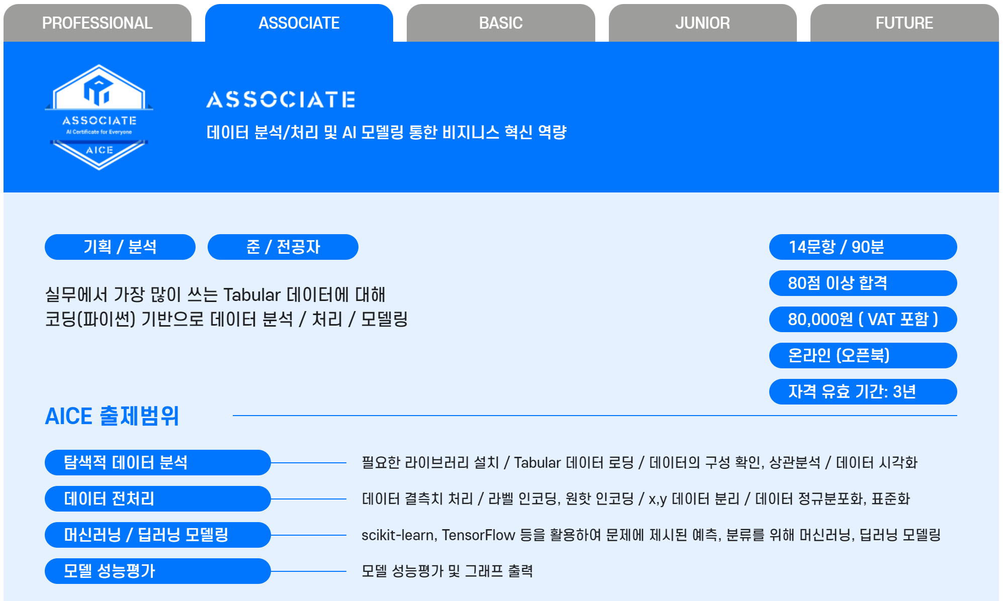 AICE(AI Certificate for Everyone) 시험이란 KT에서 직접 개발한 AI 개발자 역량 검증 시험이다. AICE 시험은 위 사진과 같이 총 다섯 단계의 레벨이 있으며 에이블스쿨에서는 Associate 등급의 자격 시험을 무료로 1회 지원해준다. AICE Associate 는 에이블스쿨의 커리큘럼을 잘 소화했다면 충분히 합격할 수 있는 수준의 난이도이다. 출제 범위는 위 사진과 같이 데이터 분석부터 전처리, ML/DL 모델링, 성능평가까지 AI 개발 프로세스 전반에 걸쳐서 기본적인 활용 능력을 평가한다. 월, 화 이틀간 시험과 비슷한 유형의 문제들을 풀고 팀원들과 함께 토의하는 시간을 갖었는데, 그동안 배웠던 내용과 수행했던 프로젝트 난이도에 비해 상대적으로 쉬웠기 때문에 약간 여유롭게 휴가를 받은 느낌이었다.